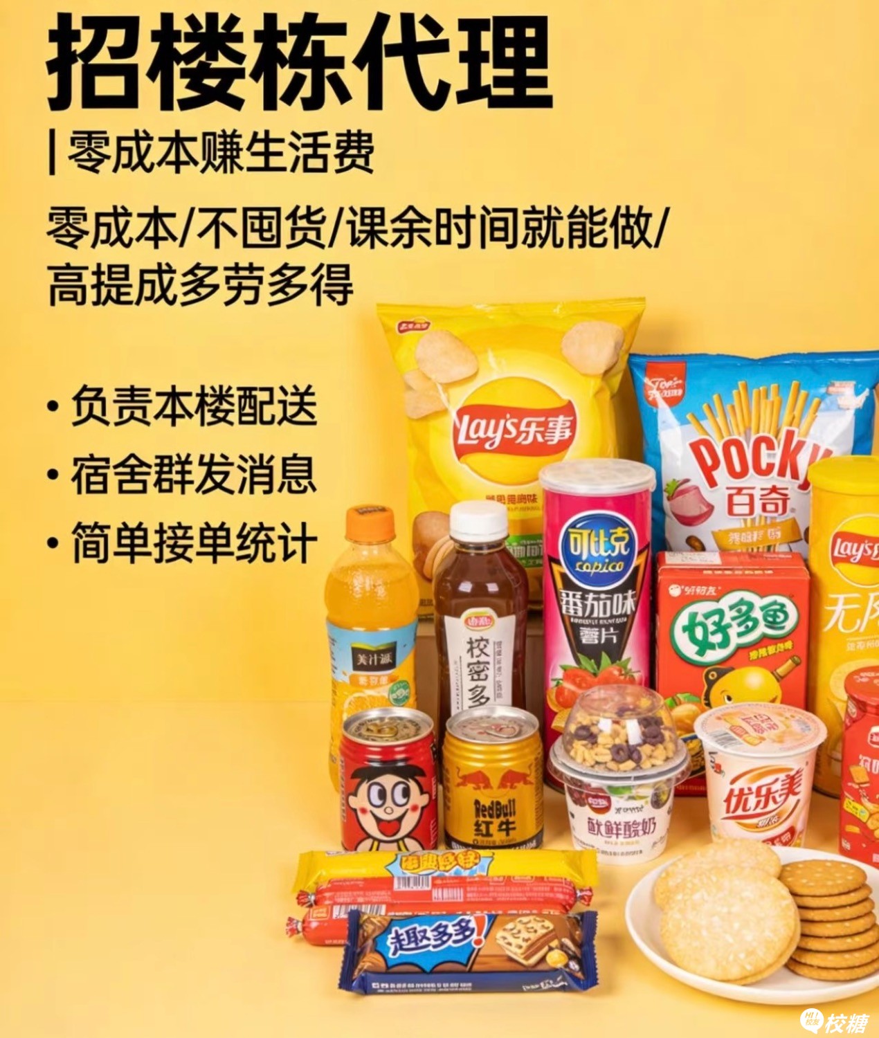 工艺美院宿舍零食店,现招每栋楼负责人: 1. 负责本宿舍楼订单配送、群内简单推广 2. 零投入、不囤货、总部统一供货 3. 时间自由,课余就能做 4. 按单高提成,结算灵活 要求:苏职大在校学生,认真负责,有宿舍...